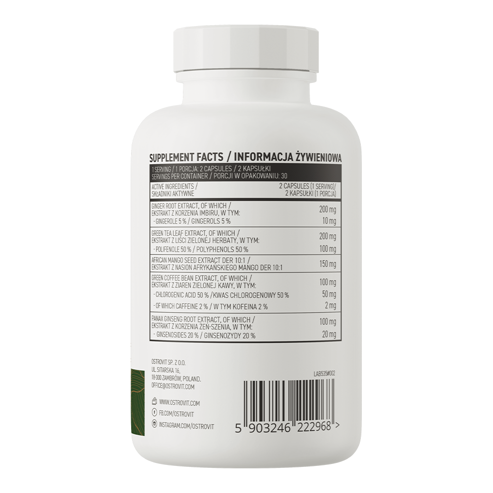 OstroVit Fat Burner VEGE ir rūpīgi sabalansēts ekstraktu maisījums, kas satur ingvera sakni, zaļās tējas lapas, Āfrikas mango sēklas, zaļās kafijas pupiņas un Korejas žeņšeņa sakni. Standartizētie ekstrakti palīdz paātrināt vielmaiņu, veicina lipolīzi, atbalsta termoģenēzi un uzlabo imūnsistēmas darbību.